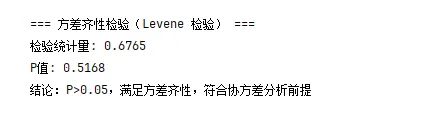 阶段2:方差齐性检验,验证协方差分析的方差齐性前提,笔者换了下,这里与R版稍微有所区别# ===================== 方差齐性检验(Levene检验,鲁棒性更强) =====================levene_result = stats.levene(y1, y2, y3)print("\n=== 方差齐性检验(Levene 检验) ===")print(f"检验统计量: {levene_result.statistic:.4f}")print(f"P值: {levene_result.pvalue:.4f}")# 结果解读if levene_result.pvalue > 0.05: print("结论:P>0.05,满足方差齐性,符合协方差分析前提")else: print("结论:P≤0.05,方差不齐,需谨慎使用协方差分析")