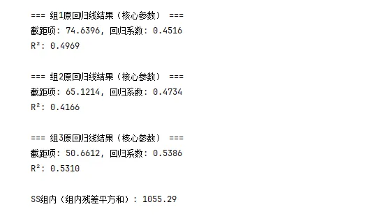 阶段3:拟合各组原回归线+计算SS组内,拟合三组Y对X的原始回归线,获取预测值并计算组内残差平方和# ===================== 定义回归拟合函数(复用) =====================def fit_linear_reg(x_data, y_data): """ 拟合线性回归模型(适配statsmodels) 返回:回归模型、Y预测值 """ x_sm = sm.add_constant(x_data) # 添加截距项(R的lm默认包含) model = sm.OLS(y_data, x_sm).fit() # 普通最小二乘回归 y_hat = model.predict(x_sm) # 预测值 return model, y_hat# ===================== 拟合各组原回归线 =====================# 组1原回归线model1, y1_hat = fit_linear_reg(x1, y1)print("\n=== 组1原回归线结果(核心参数) ===")print(f"截距项: {model1.params[0]:.4f}, 回归系数: {model1.params[1]:.4f}")print(f"R²: {model1.rsquared:.4f}")# 组2原回归线model2, y2_hat = fit_linear_reg(x2, y2)print("\n=== 组2原回归线结果(核心参数) ===")print(f"截距项: {model2.params[0]:.4f}, 回归系数: {model2.params[1]:.4f}")print(f"R²: {model2.rsquared:.4f}")# 组3原回归线model3, y3_hat = fit_linear_reg(x3, y3)print("\n=== 组3原回归线结果(核心参数) ===")print(f"截距项: {model3.params[0]:.4f}, 回归系数: {model3.params[1]:.4f}")print(f"R²: {model3.rsquared:.4f}")# ===================== 计算SS组内 =====================ss_within = np.sum((y1 - y1_hat)**2) + np.sum((y2 - y2_hat)**2) + np.sum((y3 - y3_hat)**2)ss_within = round(ss_within, 2) # 保留2位小数print(f"\nSS组内(组内残差平方和): {ss_within}")
