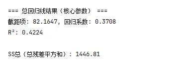 阶段 4:拟合总回归线+计算SS总,拟合合并数据的总回归线,获取总预测值并计算总残差平方和# ===================== 拟合总回归线 =====================model_total, y_hat = fit_linear_reg(x, y)print("\n=== 总回归线结果(核心参数) ===")print(f"截距项: {model_total.params[0]:.4f}, 回归系数: {model_total.params[1]:.4f}")print(f"R²: {model_total.rsquared:.4f}")# ===================== 计算SS总 =====================ss_total = np.sum((y - y_hat)**2)ss_total = round(ss_total, 2)print(f"\nSS总(总残差平方和): {ss_total}")