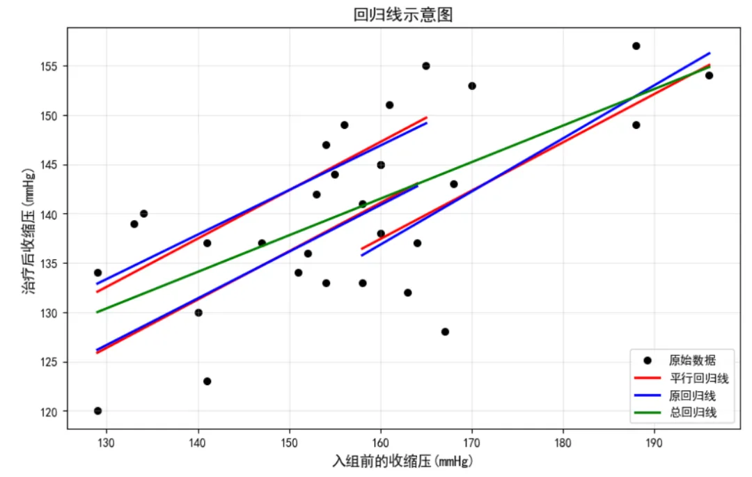 阶段7:回归线可视化,绘制散点图+三组原回归线+三组平行回归线+总回归线# ===================== 绘制回归线示意图(修正版) =====================plt.rcParams['font.sans-serif'] = ['SimHei'] # 解决中文显示问题plt.rcParams['axes.unicode_minus'] = False # 解决负号显示问题# 基础散点图plt.figure(figsize=(10, 6))plt.scatter(x, y, color='black', s=30, label='原始数据')# 绘制平行回归线(红色)x1_sorted = np.sort(x1)y1_pxhat_sorted = np.mean(y1) - bc*np.mean(x1) + bc*x1_sortedplt.plot(x1_sorted, y1_pxhat_sorted, color='red', linewidth=2, label='平行回归线')x2_sorted = np.sort(x2)y2_pxhat_sorted = np.mean(y2) - bc*np.mean(x2) + bc*x2_sortedplt.plot(x2_sorted, y2_pxhat_sorted, color='red', linewidth=2)x3_sorted = np.sort(x3)y3_pxhat_sorted = np.mean(y3) - bc*np.mean(x3) + bc*x3_sortedplt.plot(x3_sorted, y3_pxhat_sorted, color='red', linewidth=2)# 绘制原回归线(蓝色)y1_hat_sorted = model1.params[0] + model1.params[1]*x1_sortedplt.plot(x1_sorted, y1_hat_sorted, color='blue', linewidth=2, label='原回归线')y2_hat_sorted = model2.params[0] + model2.params[1]*x2_sortedplt.plot(x2_sorted, y2_hat_sorted, color='blue', linewidth=2)y3_hat_sorted = model3.params[0] + model3.params[1]*x3_sortedplt.plot(x3_sorted, y3_hat_sorted, color='blue', linewidth=2)# 绘制总回归线(绿色)x_sorted = np.sort(x)y_hat_sorted = model_total.params[0] + model_total.params[1]*x_sortedplt.plot(x_sorted, y_hat_sorted, color='green', linewidth=2, label='总回归线')# 图表美化(修正图例位置)plt.xlabel('入组前的收缩压(mmHg)', fontsize=12)plt.ylabel('治疗后收缩压(mmHg)', fontsize=12)plt.title('回归线示意图', fontsize=14)plt.legend(loc='lower right', fontsize=10) # 修正:bottommright → lower rightplt.grid(alpha=0.3)plt.show()