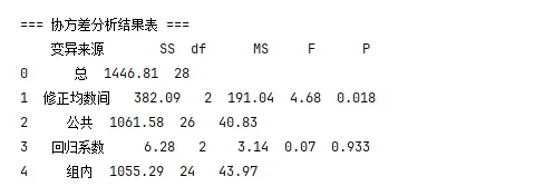 阶段 8:生成协方差分析结果# ===================== 整理基础指标 =====================# 平方和(SS)SS = [ss_total, ss_corrected_mean, ss_common, ss_reg_coef, ss_within]# 自由度(df)df_total = len(x) - 2df_corrected_mean = k - 1df_common = len(x) - k - 1df_reg_coef = k - 1df_within = len(x) - 2*kdf = [df_total, df_corrected_mean, df_common, df_reg_coef, df_within]# 均方(MS)ms_corrected_mean = ss_corrected_mean / df_corrected_meanms_common = round(ss_common / df_common, 2)ms_reg_coef = ss_reg_coef / df_reg_coefms_within = round(ss_within / df_within, 2)MS = ["", round(ms_corrected_mean, 2), ms_common, round(ms_reg_coef, 2), ms_within]# F值f_corrected_mean = round(ms_corrected_mean / (ss_common / df_common), 2)f_parallel = round(ms_reg_coef / (ss_within / df_within), 2)F = ["", f_corrected_mean, "", f_parallel, ""]# P值(F检验)- 修正参数名:df1→dfn,df2→dfdp_corrected_mean = 1 - stats.f.cdf(f_corrected_mean, dfn=df_corrected_mean, dfd=df_common)p_parallel = 1 - stats.f.cdf(f_parallel, dfn=df_reg_coef, dfd=df_within)P = ["", round(p_corrected_mean, 3), "", round(p_parallel, 3), ""]# ===================== 构建结果表 =====================result_df = pd.DataFrame({ "变异来源": ["总", "修正均数间", "公共", "回归系数", "组内"], "SS": SS, "df": df, "MS": MS, "F": F, "P": P})print("\n=== 协方差分析结果表 ===")print(result_df)