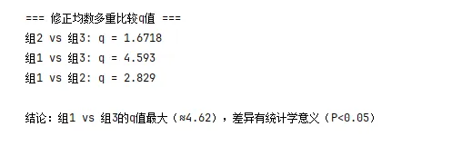 阶段 9:修正均数多重比较(q检验)# ===================== 修正均数多重比较(q检验) =====================# 计算组间lxx(zjlxx)zjx = np.array([np.mean(x1), np.mean(x2), np.mean(x3)])zjlxx = np.sum(zjx**2) - (np.sum(zjx))**2 / len(zjx)# 重新计算组内lxxlxx1 = np.sum(x1**2) - (np.sum(x1))**2 / len(x1)lxx2 = np.sum(x2**2) - (np.sum(x2))**2 / len(x2)lxx3 = np.sum(x3**2) - (np.sum(x3))**2 / len(x3)lxx_total = lxx1 + lxx2 + lxx3# 计算q值ms_within_num = float(ms_within) # 转换为数值型(避免字符串干扰)q1 = (xzy2 - xzy3) / np.sqrt(ms_within_num/10 * (1 + zjlxx/4127.2)) # 组2vs组3q2 = (xzy1 - xzy3) / np.sqrt(ms_within_num/10 * (1 + zjlxx/(2*4127.2))) # 组1vs组3q3 = (xzy1 - xzy2) / np.sqrt(ms_within_num/10 * (1 + zjlxx/4127.2)) # 组1vs组2print("\n=== 修正均数多重比较q值 ===")print(f"组2 vs 组3: q = {round(q1, 4)}")print(f"组1 vs 组3: q = {round(q2, 4)}")print(f"组1 vs 组2: q = {round(q3, 4)}")# 结果解读print("\n结论:组1 vs 组3的q值最大(≈4.62),差异有统计学意义(P<0.05)")