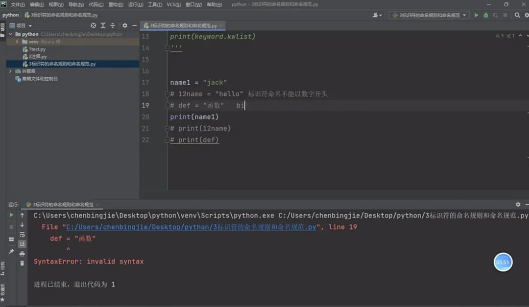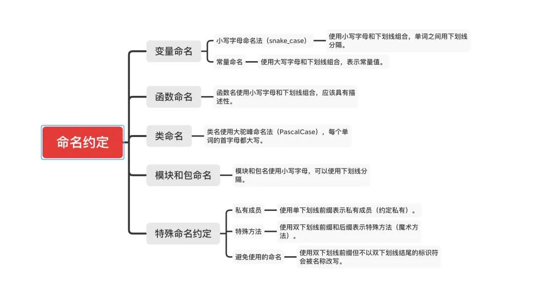 标识符是Python中用于标识变量、函数、类、模块等程序元素的名称。良好的命名规范不仅能提高代码的可读性,还能体现程序员的专业素养。
