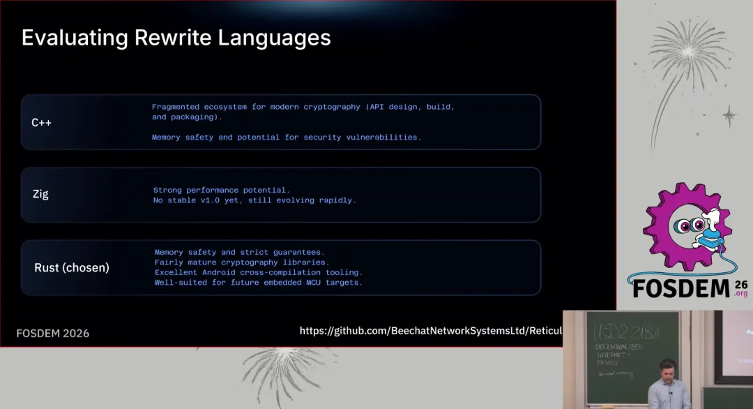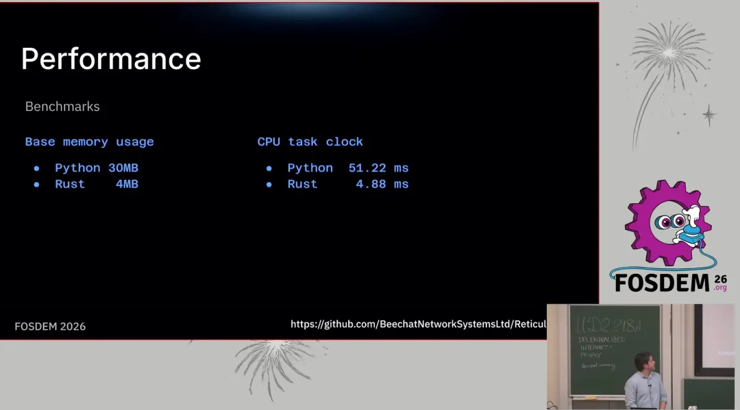 就在这个月,FOSDEM 2026 大会上有个演讲叫“Reticulum-rs: Porting the Trustless Mesh from Python to Rust”。这个项目很有意思——Reticulum 原本是基于 Python 的点对点 Mesh 网络栈,但在 Android 和嵌入式设备上跑的时候暴露了严重的性能瓶颈:高延迟、低吞吐量、CPU 开销过大,尤其是在 Android 设备上。