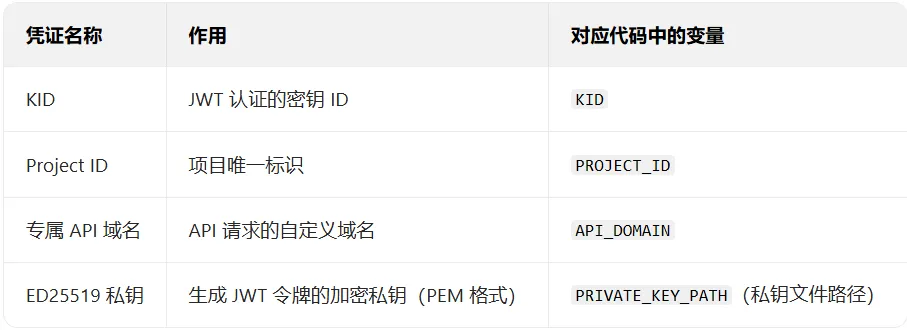 ①访问和风天气开发者平台:https://dev.qweather.com/;③进入 “控制台 - 项目管理”,点击 “创建项目”,选择 “个人版”(免费);④项目创建后,在 “配置管理” 中开启 “天气 API” 权限(实时天气、7 天预报等)。2.获取 4 个核心开发凭证