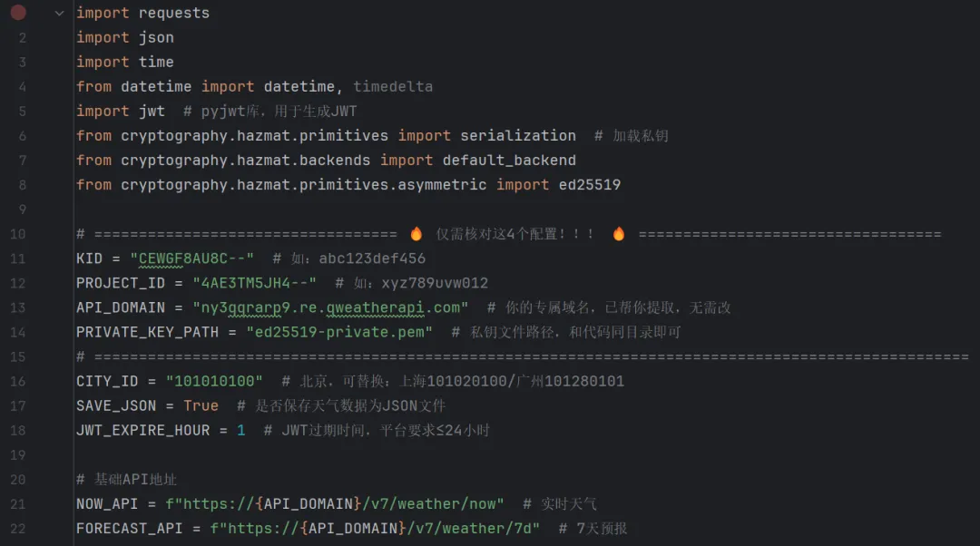 ①核心流程:私钥加载 → JWT 令牌生成 → API 请求 → 数据解析 → 保存文件;l移除lang参数,避免 400 参数错误(和风天气免费版默认返回简体中文);l使用dict.get()替代直接取值,避免 KeyError,提升代码健壮性;l严格遵循和风天气 JWT 认证规范,确保请求合法;l替换代码中 4 个核心凭证为自己的信息,否则无法运行;l私钥文件需与代码放在同一目录,命名为ed25519-private.pem;l免费版 API 有每日调用次数限制,避免高频请求。2.5 以上内容的总结
