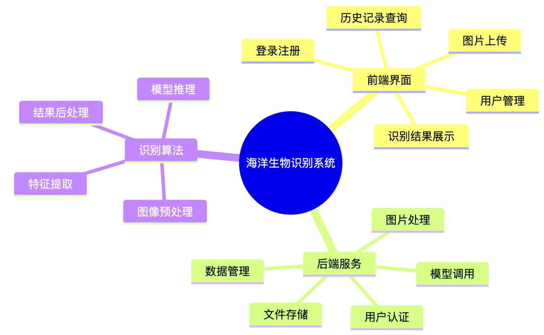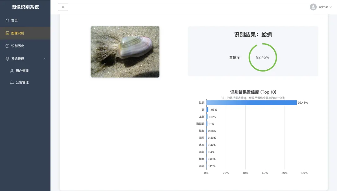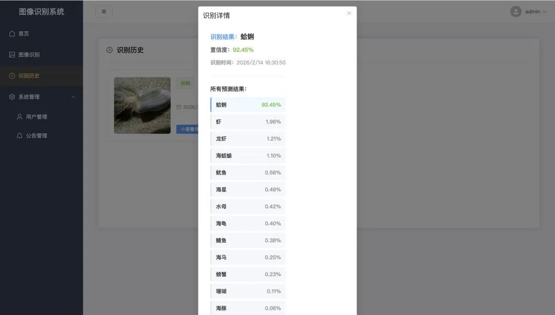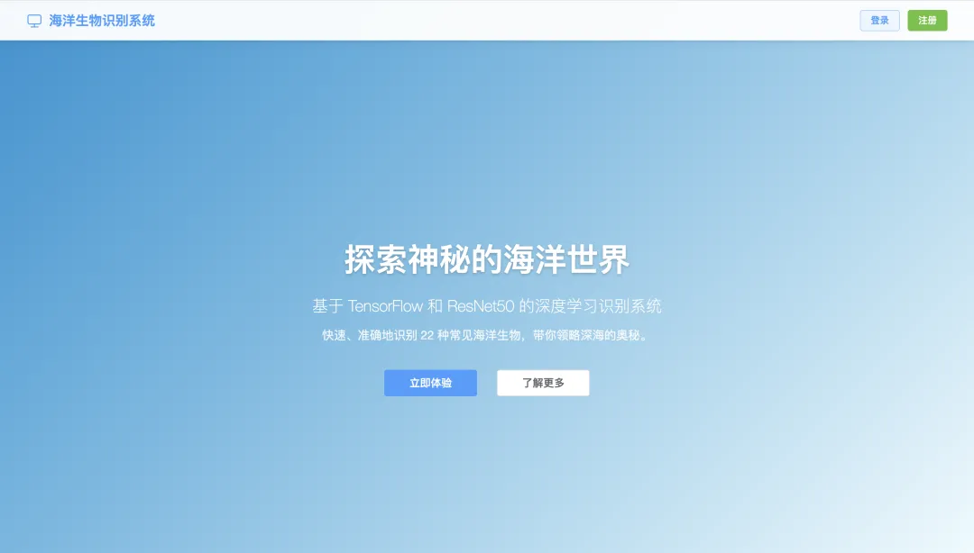 本项目是一个基于深度学习的海洋生物识别系统,采用前后端分离架构实现。前端使用Vue3+Element Plus构建直观友好的用户界面,提供图片上传、识别结果展示、历史记录查询等功能;后端基于Flask框架开发,负责处理前端请求、管理用户数据、调用识别算法;核心识别功能采用TensorFlow深度学习框架,结合ResNet50卷积神经网络模型实现高效准确的海洋生物图像识别。