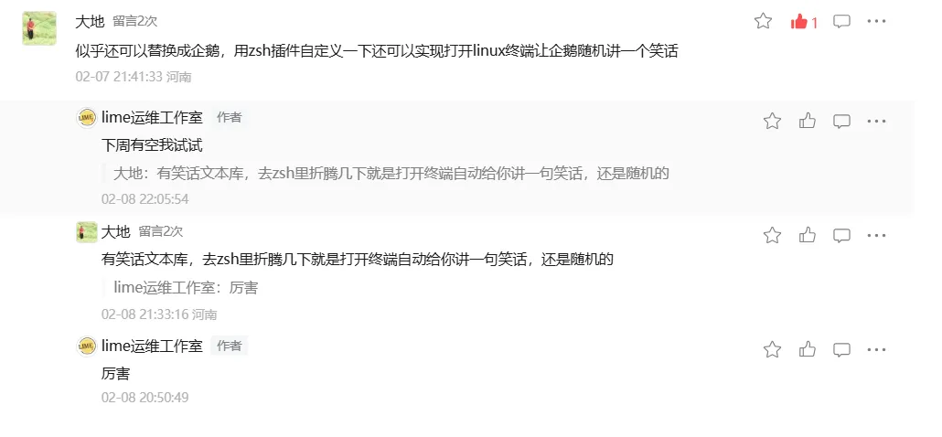 3. 获取笑话 API(免费公开接口)用 https://official-joke-api.appspot.com/random_joke 这个免费接口。4. 在 ~/.zshrc 中添加自定义函数tuxjoke() { # 获取随机笑话(setup + punchline) local joke_json joke_json=$(curl -s "https://official-joke-api.appspot.com/random_joke") if [[ $? -ne 0 || -z "$joke_json" ]]; then echo "🐧: 网络不好,我今天心情也不太好..." return 1 fi local setup=$(echo "$joke_json" | python3 -c "import sys, json; print(json.load(sys.stdin)['setup'])" 2>/dev/null) local punchline=$(echo "$joke_json" | python3 -c "import sys, json; print(json.load(sys.stdin)['punchline'])" 2>/dev/null) # 如果没有 python3,可用 jq(推荐安装) # setup=$(echo "$joke_json" | jq -r '.setup') # punchline=$(echo "$joke_json" | jq -r '.punchline') local full_joke="$setup\n$punchline" # 使用 cowsay + tux if command -v cowsay &>/dev/null && [[ -f ~/.local/share/cows/tux.cow ]]; then echo -e "$full_joke" | cowsay -f tux else # 备用:直接打印企鹅 + 笑话 cat << EOF _______ / \\ | O O | | ∆ | $setup | \\___/ | $punchline 😄 \\_______/EOF fi}