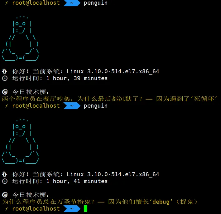 penguin() { echo -e "\033[36m" cat << 'EOF' .--. |o_o | |:_/ | // \ \ (| | )/'\_ _/`\\___)=(___/EOF echo -e "\033[0m" # 系统信息 echo "🐧 你好!当前系统: $(uname -s) $(uname -r)" echo "🕒 运行时间: $(uptime -p | sed 's/up //')" # 中文笑话数组(3个) jokes=( "程序员最讨厌康熙的哪个儿子?—— 胤禩(谐音:bug)" "为什么程序员总在万圣节扮鬼?—— 因为他们擅长‘debug’(捉鬼)" "两个程序员在餐厅吵架,为什么最后都沉默了?—— 因为遇到了‘死循环’" ) # 随机选择笑话(优先用shuf,兼容性方案) if command -v shuf &> /dev/null; then random_joke=$(shuf -n1 <<< "$(printf "%s\n" "${jokes[@]}")") else random_joke=${jokes[$RANDOM % ${#jokes[@]}]} fi # 显示笑话(中文黄色高亮) echo -e "\n🎯 今日技术梗:" echo -e "\033[33m$random_joke\033[0m"}