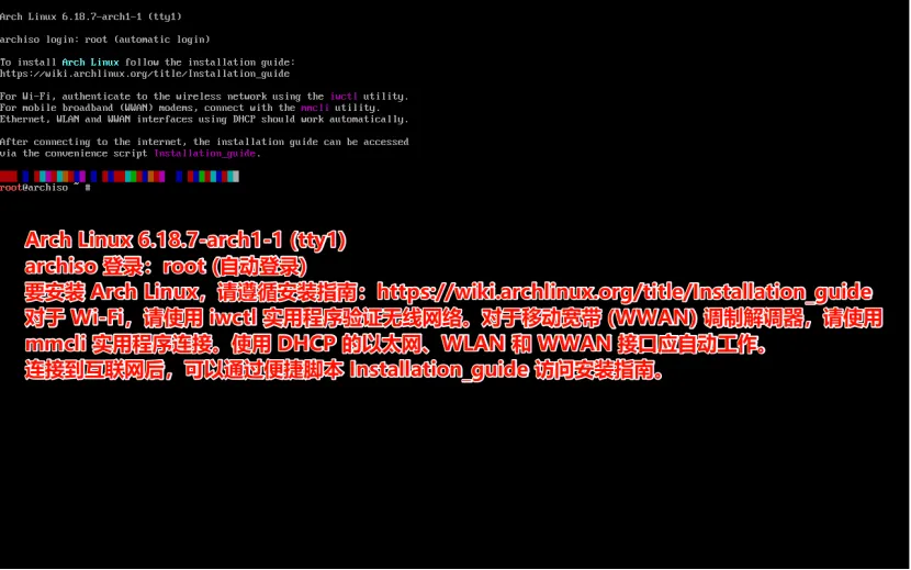 #默认的控制台键位映射是美国 。可用的布局可列出:localectl list-keymaps#要设置键盘布局,将其名称传递给 loadkeys(1)。 例如,要设置德语键盘布局:loadkeys de-latin1cat /sys/firmware/efi/fw_platform_size#如果命令返回 64,系统将进入 UEFI 模式,并使用 64 位 x64 UEFI。#如果命令返回 32,系统将以 UEFI 模式启动,并使用 32 位 IA32 UEFI。虽然支持这种方式,但会限制引导加载程序的选择,只能支持混合模式启动。#如果返回 “无此类文件或目录”,系统可能以 BIOS(或 CSM)模式启动。