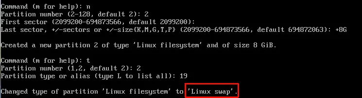 n # 新建分区 2(Swap)2 # 分区号[回车] # 默认起始扇区+8G # 大小 8GB(建议与物理内存相同,或 2-4G)t # 更改分区类型2 # 选择分区 219 # 类型选 19 = Linux swap