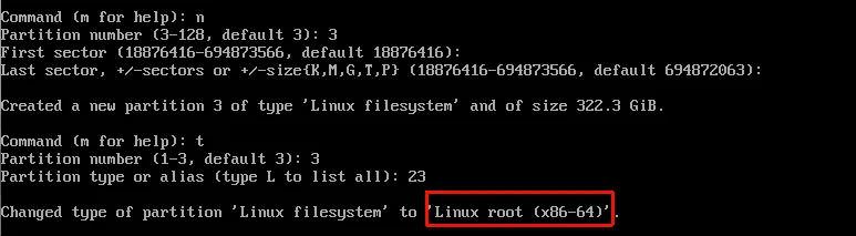 n # 新建分区 3(Root)3 # 分区号[回车] # 默认起始扇区[回车] # 默认结束(使用剩余全部空间)t # 更改分区类型3 # 选择分区 323 # 类型选 23 = Linux Root (x86-64)