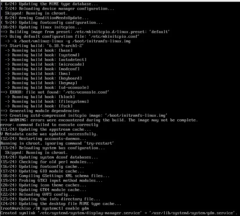 locale-genecho "LANG=en_US.UTF-8" > /etc/locale.conf#如果要安装图形工具汉化,改成:zh_CN.UTF-8passwd# 安装 GRUB 和 EFI 工具pacman -S grub efibootmgr# 安装 GRUB 到 EFI 分区grub-install --target=x86_64-efi --efi-directory=/boot --bootloader-id=GRUB# 生成配置文件grub-mkconfig -o /boot/grub/grub.cfg安装图形界面(可选,但推荐现在做,省得进 TTY 再折腾)图形界面不能用 root 登录,必须先创建用户: