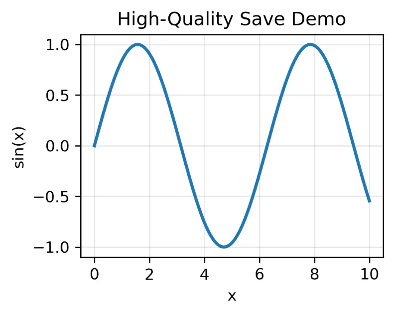 import osimport numpy as npimport matplotlib.pyplot as pltOUT_DIR = r"D:\py_figs"os.makedirs(OUT_DIR, exist_ok=True)x = np.linspace(0, 10, 200)y = np.sin(x)fig, ax = plt.subplots(figsize=(3.5, 2.6)) # 单栏尺寸示例ax.plot(x, y, linewidth=2)ax.set_title("High-Quality Save Demo")ax.set_xlabel("x")ax.set_ylabel("sin(x)")ax.grid(alpha=0.3)base = os.path.join(OUT_DIR, "fig_save_demo")# 1) JPG(通用、体积小)fig.savefig(base + ".jpg", dpi=300, bbox_inches="tight")# 2) PNG(无损,更适合论文位图)fig.savefig(base + ".png", dpi=300, bbox_inches="tight")# 3) PDF(矢量:线条图首选)fig.savefig(base + ".pdf", bbox_inches="tight")plt.close(fig)