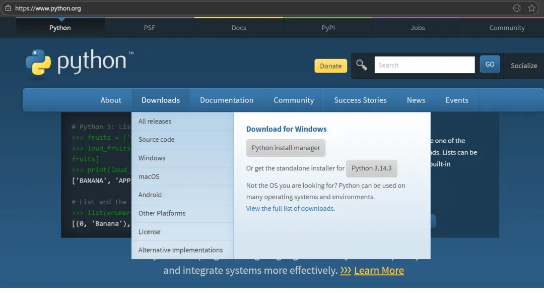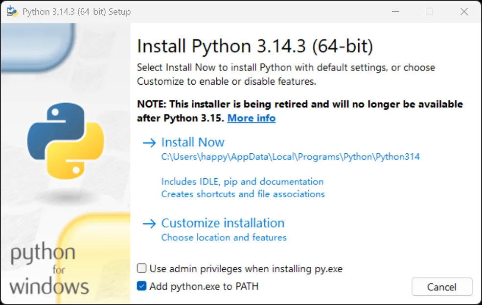 我在上方“Python程序安装”的时候才看到从3.15版本开始就不再提供独立的Windows安装程序了,估计是得用“Python Install Manager”进行。