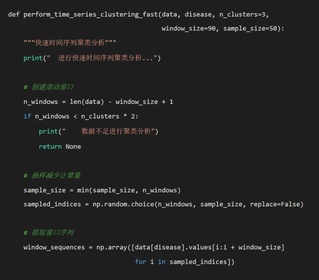 # pip install dtaidistance tslearn pandas numpy matplotlib seaborn scikit-learn joblibimport osimport pandas as pdimport numpy as npimport matplotlib.pyplot as pltimport seaborn as snsfrom datetime import datetime, timedeltaimport warningswarnings.filterwarnings('ignore')# 时间序列分析相关库from dtaidistance import dtwfrom tslearn.clustering import TimeSeriesKMeansfrom tslearn.preprocessing import TimeSeriesScalerMeanVariancefrom sklearn.metrics import mean_squared_error, mean_absolute_error, r2_scorefrom sklearn.preprocessing import StandardScalerimport joblib# 设置中文字体plt.rcParams['font.sans-serif'] = ['SimHei', 'Microsoft YaHei', 'DejaVu Sans']plt.rcParams['axes.unicode_minus'] = Falsedef get_desktop_path():"""获取桌面路径"""return os.path.join(os.path.expanduser("~"), "Desktop")def create_directories(base_path):"""创建必要的目录结构""" directories = ["Models","Predictions","Plots","Clustering","Distance_Matrices","Pattern_Analysis" ]for directory in directories: dir_path = os.path.join(base_path, directory)if not os.path.exists(dir_path): os.makedirs(dir_path)print(f"创建目录: {dir_path}")def prepare_dtw_data(data, disease_col, date_col='timestamp'):"""准备DTW分析数据"""# 确保日期格式正确 data[date_col] = pd.to_datetime(data[date_col])# 创建完整的时间序列 full_dates = pd.date_range(start=data[date_col].min(), end=data[date_col].max(), freq='D') full_df = pd.DataFrame({date_col: full_dates})# 合并数据 disease_data = data[[date_col, disease_col]].merge( full_df, on=date_col, how='right' ).sort_values(date_col).reset_index(drop=True)# 处理缺失值 disease_data[disease_col] = disease_data[disease_col].interpolate(method='linear') disease_data[disease_col] = disease_data[disease_col].ffill().bfill()return disease_datadef calculate_dtw_distance_fast(ts1, ts2, window_size=None):"""快速DTW距离计算"""if len(ts1) == 0 or len(ts2) == 0 or np.all(np.isnan(ts1)) or np.all(np.isnan(ts2)):return np.nan try:# 使用DTAIDistance库的快速DTW实现if window_size is not None: distance = dtw.distance_fast(ts1, ts2, window=window_size)else: distance = dtw.distance_fast(ts1, ts2)return distance except Exception as e:print(f"DTW计算错误: {e}")return np.nandef dtw_knn_forecast_optimized(train_series, test_series, k=3, window_size=90, sample_ratio=0.3, dtw_window=20):"""优化的基于DTW的KNN预测(不使用嵌套并行)""" n_test = len(test_series) predictions = np.full(n_test, np.nan)# 预处理:标准化序列 scaler = StandardScaler() train_series_z = scaler.fit_transform(train_series.reshape(-1, 1)).flatten() test_series_z = scaler.transform(test_series.reshape(-1, 1)).flatten()# 从训练集中抽样以减少计算量 n_train = len(train_series) sample_size = max(50, int(n_train * sample_ratio)) train_indices = np.random.choice(n_train - window_size, sample_size, replace=False)# 预计算训练窗口 train_windows = [train_series_z[i:i + window_size] for i in train_indices]# 对每个测试点进行预测(不使用并行)for i in range(n_test):if i < window_size:# 对于前window_size个点,使用简单平均 predictions[i] = np.mean(train_series)continue# 提取当前窗口 current_window = test_series_z[i - window_size:i]# 计算距离 distances = []for j, train_window in enumerate(train_windows): dist = calculate_dtw_distance_fast(current_window, train_window, dtw_window)if not np.isnan(dist): distances.append((dist, j))if not distances: predictions[i] = np.mean(train_series)continue# 找到K个最近邻 distances.sort(key=lambda x: x[0]) k_actual = min(k, len(distances)) nearest_indices = [idx for _, idx in distances[:k_actual]]# 获取最近邻的下一个值作为预测 neighbor_values = [train_series[train_indices[idx] + window_size] for idx in nearest_indices] neighbor_weights = [1 / (distances[idx][0] + 1e-8) for idx in range(k_actual)]# 使用距离倒数加权平均 predictions[i] = np.average(neighbor_values, weights=neighbor_weights)return predictions