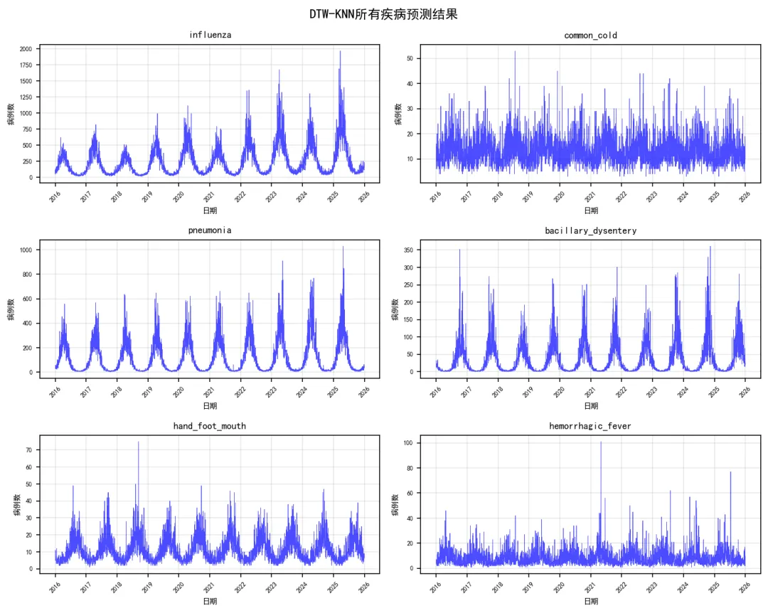 try:# 标准化时间序列 scaler = TimeSeriesScalerMeanVariance() window_sequences_scaled = scaler.fit_transform(window_sequences)# 使用TimeSeriesKMeans进行聚类 km = TimeSeriesKMeans(n_clusters=n_clusters, metric="dtw", random_state=42) labels = km.fit_predict(window_sequences_scaled) cluster_results = {'clustering': labels,'centers': km.cluster_centers_,'sampled_indices': sampled_indices,'sample_size': sample_size,'model': km }return cluster_results except Exception as e:print(f" 快速聚类分析失败: {e}")return Nonedef create_simple_forecast_plot(pred_df, disease, test_r2, test_rmse, save_path):"""创建简化版预测图""" plt.figure(figsize=(10, 6)) plt.plot(pred_df['Date'], pred_df['Actual'], label='真实值', color='blue', linewidth=1, alpha=0.8) plt.plot(pred_df['Date'], pred_df['Predicted'], label='预测值', color='red', linestyle='--', linewidth=1, alpha=0.8) plt.title(f'{disease} - DTW-KNN预测 (R²={test_r2:.3f}, RMSE={test_rmse:.1f})') plt.xlabel('日期') plt.ylabel('病例数') plt.legend() plt.grid(True, alpha=0.3) plt.tight_layout() plt.savefig(os.path.join(save_path, 'Plots', f'{disease}_DTW_Forecast.png'), dpi=150, bbox_inches='tight') plt.close()def calculate_metrics(y_true, y_pred):"""计算评估指标"""# 处理可能的NaN值 mask = ~(np.isnan(y_true) | np.isnan(y_pred)) y_true_clean = y_true[mask] y_pred_clean = y_pred[mask]if len(y_true_clean) == 0:return np.nan, np.nan, np.nan rmse = np.sqrt(mean_squared_error(y_true_clean, y_pred_clean)) mae = mean_absolute_error(y_true_clean, y_pred_clean) r2 = r2_score(y_true_clean, y_pred_clean)return rmse, mae, r2def plot_clustering_results(cluster_result, disease, save_path):"""绘制聚类结果"""if cluster_result is None:return try:# 绘制聚类中心 plt.figure(figsize=(12, 8)) centers = cluster_result['centers'].reshape(cluster_result['centers'].shape[0], -1)for i, center in enumerate(centers): plt.plot(center, label=f'Cluster {i + 1}', linewidth=2) plt.title(f'{disease} - 时间序列聚类中心') plt.xlabel('时间点') plt.ylabel('标准化值') plt.legend() plt.grid(True, alpha=0.3) plt.tight_layout() plt.savefig(os.path.join(save_path, 'Clustering', f'{disease}_Cluster_Centers.png'), dpi=150, bbox_inches='tight') plt.close()# 绘制聚类分布 plt.figure(figsize=(8, 6)) unique, counts = np.unique(cluster_result['clustering'], return_counts=True) plt.bar(unique, counts, alpha=0.7, color=plt.cm.Set1(np.linspace(0, 1, len(unique)))) plt.title(f'{disease} - 聚类分布') plt.xlabel('聚类') plt.ylabel('样本数量') plt.grid(True, alpha=0.3) plt.tight_layout() plt.savefig(os.path.join(save_path, 'Clustering', f'{disease}_Cluster_Distribution.png'), dpi=150, bbox_inches='tight') plt.close() except Exception as e:print(f" 聚类结果可视化失败: {e}")def analyze_single_disease(args):"""分析单个疾病""" disease, combined_data, optimal_k, optimal_window, sample_ratio, dtw_window = argsprint(f"正在处理疾病: {disease}") try:# 准备数据 disease_data = prepare_dtw_data(combined_data, disease)# 划分训练集和测试集 train_data = disease_data[disease_data['timestamp'] < pd.to_datetime('2016-01-01')] test_data = disease_data[disease_data['timestamp'] >= pd.to_datetime('2016-01-01')]print(f" 训练集: {len(train_data)}, 测试集: {len(test_data)}")if len(train_data) == 0 or len(test_data) == 0:print(f" 数据不足,跳过疾病: {disease}")return None# 提取时间序列 train_series = train_data[disease].values test_series = test_data[disease].values# 基于DTW的KNN预测print(" 进行快速DTW-KNN预测...") test_pred = dtw_knn_forecast_optimized( train_series, test_series, k=optimal_k, window_size=optimal_window, sample_ratio=sample_ratio, dtw_window=dtw_window )# 确保预测长度匹配 min_length = min(len(test_pred), len(test_series)) test_pred = test_pred[:min_length] test_actual = test_series[:min_length]# 计算评估指标 test_rmse, test_mae, test_r2 = calculate_metrics(test_actual, test_pred)# 存储预测结果 pred_df = pd.DataFrame({'Date': test_data['timestamp'].values[:min_length],'Actual': test_actual,'Predicted': test_pred,'Disease': disease })# 时间序列聚类分析(可选,如果数据量合适) cluster_result = Noneif len(disease_data) > 500: cluster_result = perform_time_series_clustering_fast( disease_data, disease, n_clusters=3, window_size=optimal_window, sample_size=50 )# 返回结果return {'disease': disease,'results': {'Disease': disease,'Train_Size': len(train_data),'Test_Size': min_length,'Test_RMSE': test_rmse,'Test_MAE': test_mae,'Test_R2': test_r2,'Method': 'DTW-KNN-Fast' },'predictions': pred_df,'clustering': cluster_result } except Exception as e:print(f" 处理疾病 {disease} 时出错: {e}") import traceback traceback.print_exc()return Nonedef main():"""主函数"""print("开始基于DTW距离的疾病模式分析(优化版)...")# 设置路径 desktop_path = get_desktop_path() data_path = os.path.join(desktop_path, "Results时间", "combined_weather_disease_data.csv") results_path = os.path.join(desktop_path, "Results时间DTW")# 创建目录 create_directories(results_path)# 目标疾病 target_diseases = ["influenza", "common_cold", "pneumonia","bacillary_dysentery", "hand_foot_mouth","hemorrhagic_fever" ]print(f"目标疾病: {', '.join(target_diseases)}")# 读取数据 try: combined_data = pd.read_csv(data_path) combined_data['timestamp'] = pd.to_datetime(combined_data['timestamp'])print("数据读取成功")print(f"数据时间范围: {combined_data['timestamp'].min()} 到 {combined_data['timestamp'].max()}") except Exception as e:print(f"数据读取失败: {e}")return# 设置优化参数 OPTIMAL_K = 3 OPTIMAL_WINDOW = 90 SAMPLE_RATIO = 0.2 DTW_WINDOW = 15print(f"使用优化参数: K={OPTIMAL_K} Window={OPTIMAL_WINDOW} " f"SampleRatio={SAMPLE_RATIO} DTWWindow={DTW_WINDOW}")# 存储结果 results_summary = [] predictions_list = [] clustering_results = {}# 不使用并行计算,改为顺序处理以避免序列化问题print("开