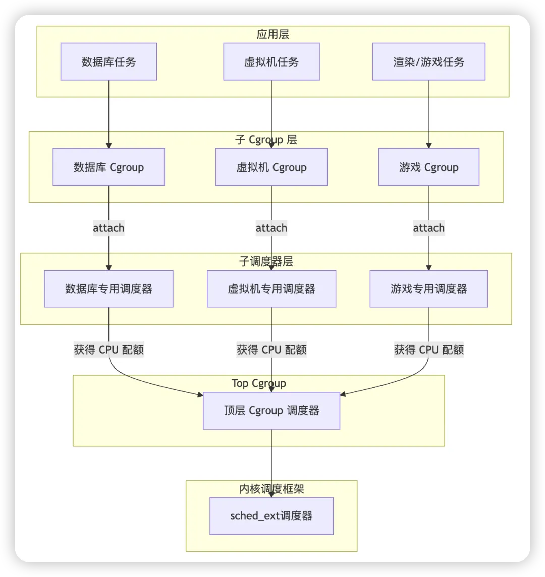 这个 patchset 来自 Tejun Heo,为 sched_ext 增加了基于 cgroup 的子调度器(sub-scheduler)支持,使多个 BPF 调度器可以按 cgroup 层级结构协同运行:父调度器负责在不同 cgroup(租户/分区)之间分配 CPU 资源,子调度器负责各自 cgroup 内部的任务调度。这样系统就能按 workload 分区部署不同调度策略,满足多租户服务器和混部场景下对差异化调度(如延迟优先、吞吐优先等)的需求。比如不同的业务类型需求不一样,可以组成如下层次化的调度系统: