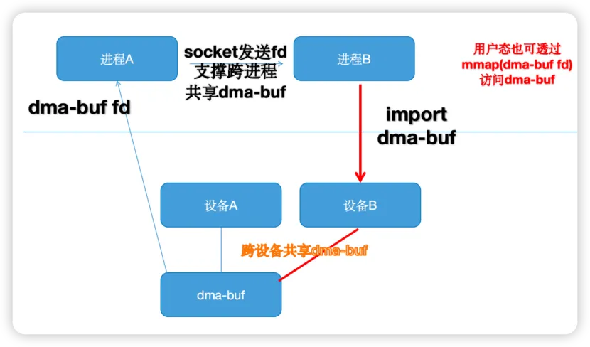 我们知道 dma-buf 提供了一种本机内部设备与设备、设备与设备共享内存的方法,之前笔者已经在《世上最好的共享内存(Linux 共享内存最透彻的一篇)》中有论述。简单地来说,dma_buf 可以实现 buffer 在多个设备的共享,应用可以把一片底层驱动 A 的 buffer 导出到用户空间成为一个 fd,也可以把 fd 导入到底层驱动 B。当然,如果进行 mmap() 得到虚拟地址,CPU 也是可以在用户空间访问到已经获得用户空间虚拟地址的底层 buffer 的。