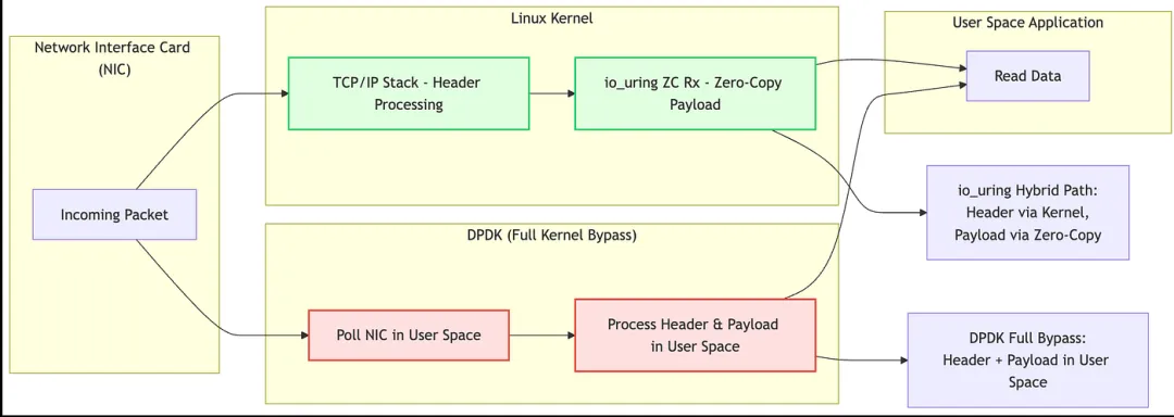 io_uring 提供了一种“混合旁路(hybrid bypass)”机制:在保持与 Linux 内核体系紧密集成的同时,实现了显著的性能提升。相比 DPDK 这种完全旁路(full bypass)方案,它在使用上更加便捷,对现有系统的侵入性也更低。
