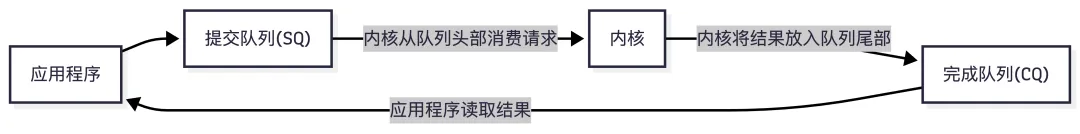 在 io_uring中,用户和内核通过 2 个 queue 交互:SQ(Submission Queue)、CQ(Completion Queue)。