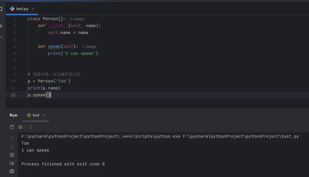class Person(): def __init__(self, name): self.name = name def speak(self): print('i can speak')# 创建对象,打印属性和方法p = Person('Tom')print(p.name)p.speak()