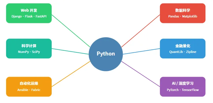 Python 在 AI 领域的统治地位源于其生态:底层高性能计算用 C/C++/CUDA 实现,上层接口用 Python 封装,兼顾开发效率与执行速度。