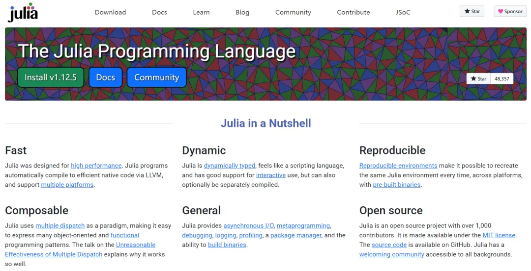 Julia(2012 年发布,MIT)旨在解决“双语言问题”:原型用易用语言,生产用高性能语言重写。