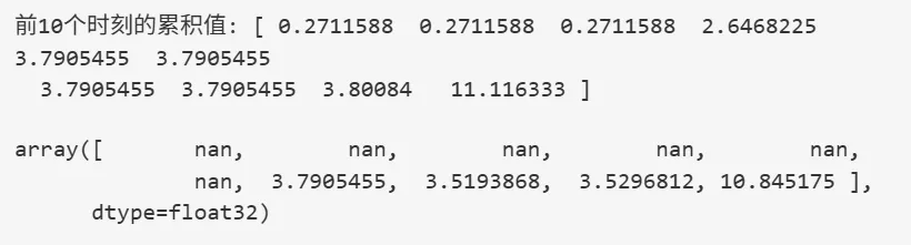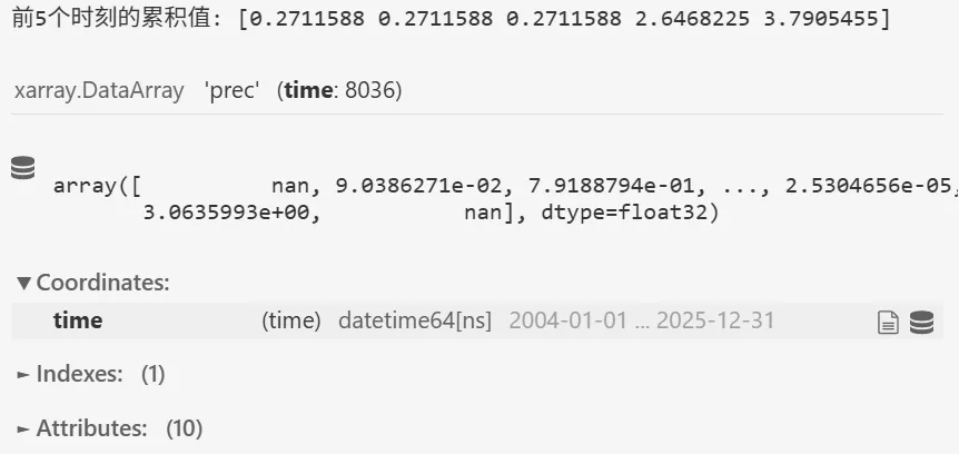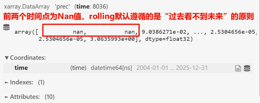 prec_rs = prec.rolling(time=7).sum()print('前10个时刻的累积值:',np.cumsum(vals[:10]))prec_rs.values[:10]