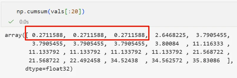 注意看,上面的第一个非空值约0.09,表示当前时刻及前2个时刻的平均降水,我们对原始降水的前20个值求累积来验证,发现第三个时刻是0.27,约等于0.9三倍,符合。