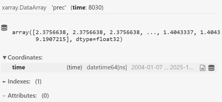 ds = xr.open_dataset('prec.nc')prec = ds['prec']vals = prec.valuesprint(vals.shape)print(vals[:20])