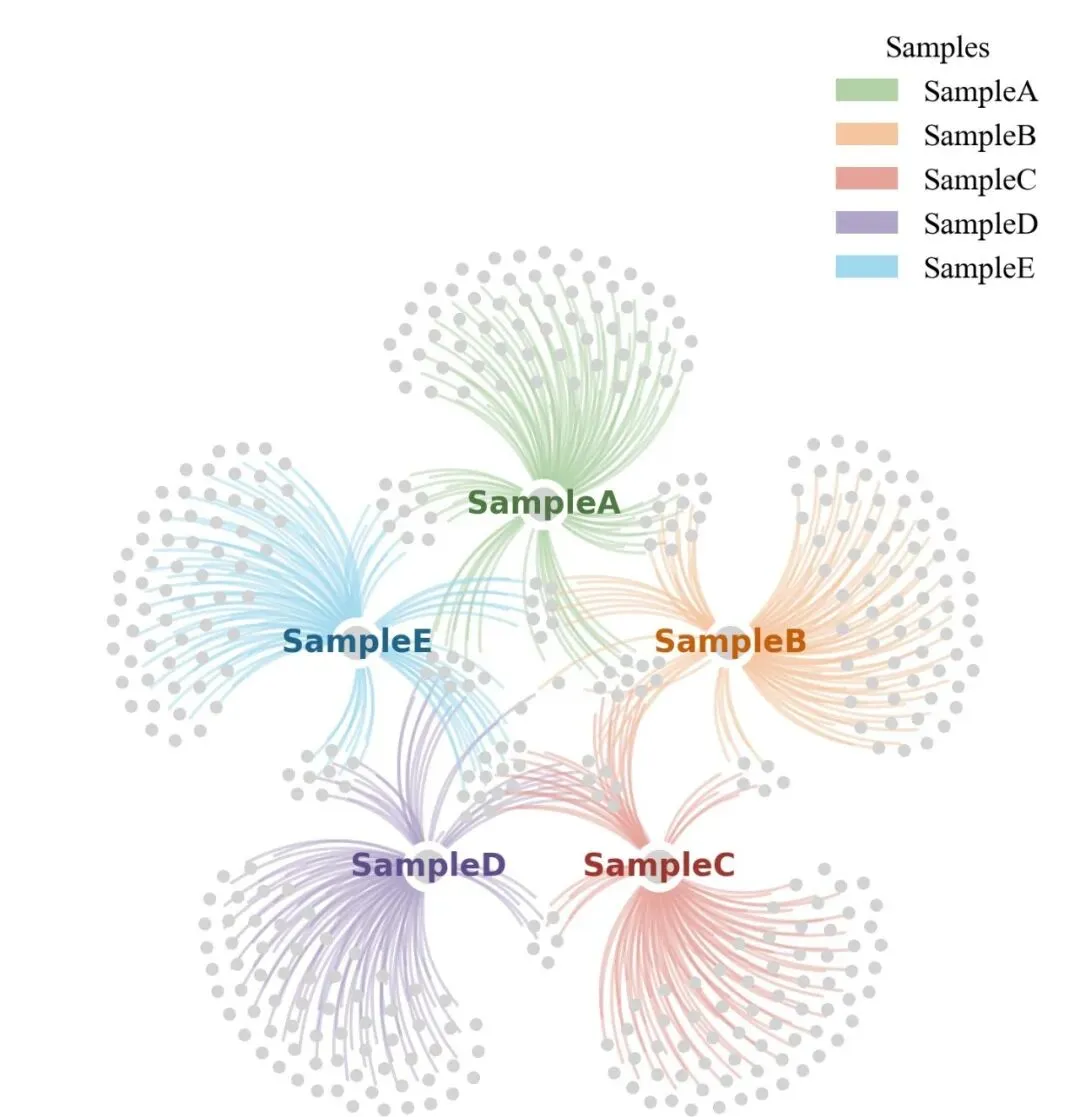 # 样本配色字典:用于边颜色custom_color_map = { "SampleA": "#b0d1a6", "SampleB": "#f5c5a0", "SampleC": "#e7a39a", "SampleD": "#b1a5c9", "SampleE": "#a0d8ef"}# 标签配色字典:用于节点文字颜色sample_label_color_map = { "SampleA": "#4f7942", "SampleB": "#c65f0a", "SampleC": "#a03530", "SampleD": "#5e4c8c", "SampleE": "#20648a"}03