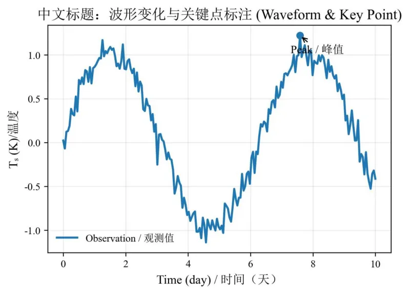 import osimport numpy as npimport matplotlib as mplimport matplotlib.pyplot as pltfrom matplotlib import font_manager as fm# == 0) 显式注册字体(关键!解决方框)==def _try_add_font(font_full_path: str):if font_full_path and os.path.exists(font_full_path):try:fm.fontManager.addfont(font_full_path)except Exception:passWIN_FONTS = r"C:\Windows\Fonts"TIMES_TTF_CANDIDATES = [os.path.join(WIN_FONTS, "times.ttf"), # Times New Roman Regularos.path.join(WIN_FONTS, "timesbd.ttf"),os.path.join(WIN_FONTS, "timesi.ttf"),]SIMSUN_TTC_CANDIDATE = os.path.join(WIN_FONTS, "simsun.ttc") # 宋体for p in TIMES_TTF_CANDIDATES:_try_add_font(p)_try_add_font(SIMSUN_TTC_CANDIDATE)# == 1) 全局字体策略(英文优先 Times,中文回退 SimSun) ==# 关键点:font.family 直接给 “列表”,Matplotlib 会按顺序找字形并回退mpl.rcParams["font.family"] = ["Times New Roman", "SimSun"]# 数学公式统一 Times New Roman(避免公式风格跳变)mpl.rcParams["mathtext.fontset"] = "custom"mpl.rcParams["mathtext.rm"] = "Times New Roman"mpl.rcParams["mathtext.it"] = "Times New Roman:italic"mpl.rcParams["mathtext.bf"] = "Times New Roman:bold"# 负号稳定(配合中文字体常用)mpl.rcParams["axes.unicode_minus"] = False# ==2) 输出路径==OUT_DIR = r"D:\py_figs"os.makedirs(OUT_DIR, exist_ok=True)# ==3) 数据==x = np.linspace(0, 10, 200)y = np.sin(x) + 0.1 * np.random.randn(len(x))# ==4) 画图==fig, ax = plt.subplots(figsize=(6, 4))ax.plot(x, y, linewidth=2, label="Observation / 观测值")ax.set_title("中文标题:波形变化与关键点标注 (Waveform & Key Point)", fontsize=14)ax.set_xlabel("Time (day) / 时间(天)", fontsize=12)ax.set_ylabel("Tₛ (K)/温度", fontsize=12)idx = np.argmax(y)x0, y0 = x[idx], y[idx]ax.scatter([x0], [y0], s=40)ax.annotate("Peak / 峰值",xy=(x0, y0),xytext=(x0 - 0.3, y0 -0.2),arrowprops=dict(arrowstyle="->", lw=1),fontsize=11,)ax.legend(frameon=False)ax.grid(alpha=0.25)# == 5) 保存==out_path = os.path.join(OUT_DIR, "text_system_demo.jpg")fig.savefig(out_path, dpi=300, bbox_inches="tight")plt.close(fig)print("Saved:", out_path)