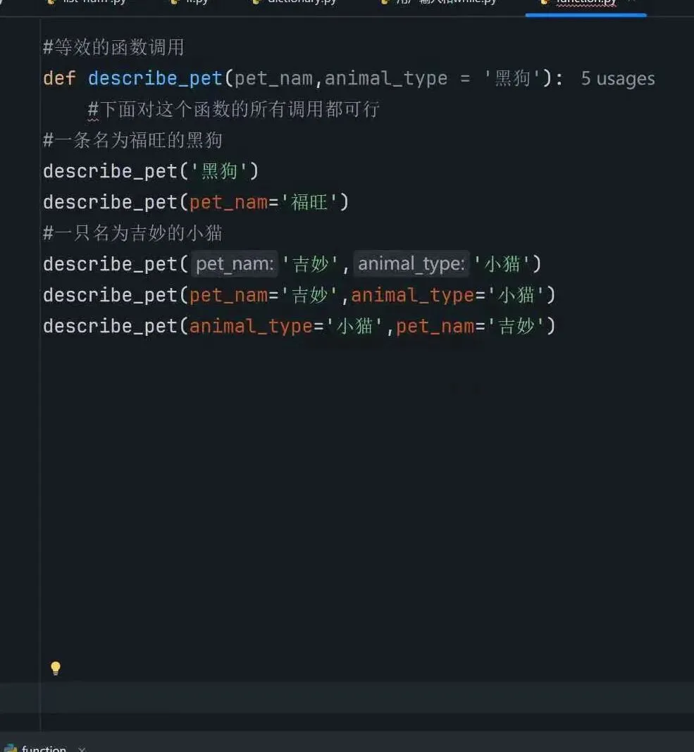 鉴于可混合使用位置实参,关键字实参,默认值,通常有多种等效的函数调用方式。如下面的图:describe_pet( )函数的定义给形参animal_type提供了默认值。基于这种定义在任何情况下,都必须给pat_ name提供实参。在指定该实参时,既可以使用位置实参,也可以使用关键字实参,如果要描写的动物不是黑狗,也必须在函数调用中给animal_type提供实参。同样在指定该实参时既可以使用位置实参,也可以使用关键字实参。注意⚠️图中对这个函数的所有调用都是可行的。在这里使用哪种调用方式都不重要,关键是使用对自己来说,最容易理解的调用方法,只要函数调用能生成期望的输出就行。