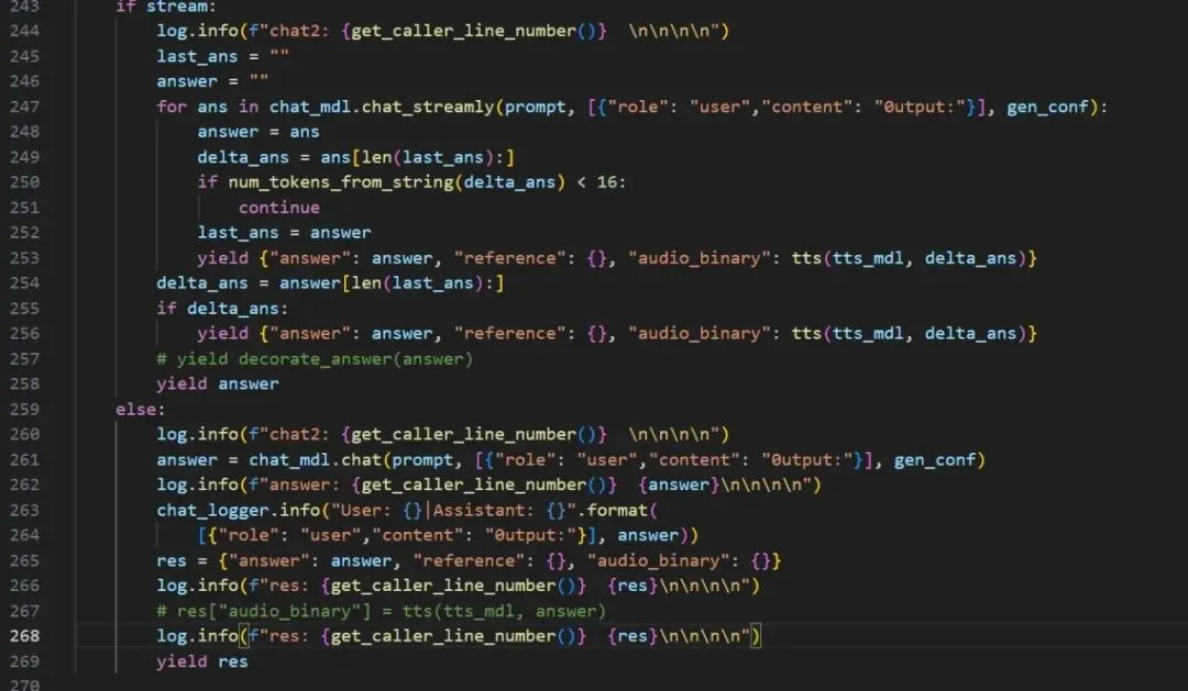 answer = chat_mdl.chat(prompt, msg[1:], gen_conf) chat_logger.info("User: {}|Assistant: {}".format( msg[-1]["content"], answer)) res = decorate_answer(answer) res["audio_binary"] = tts(tts_mdl, answer) yield res