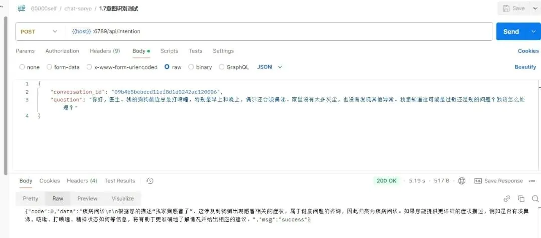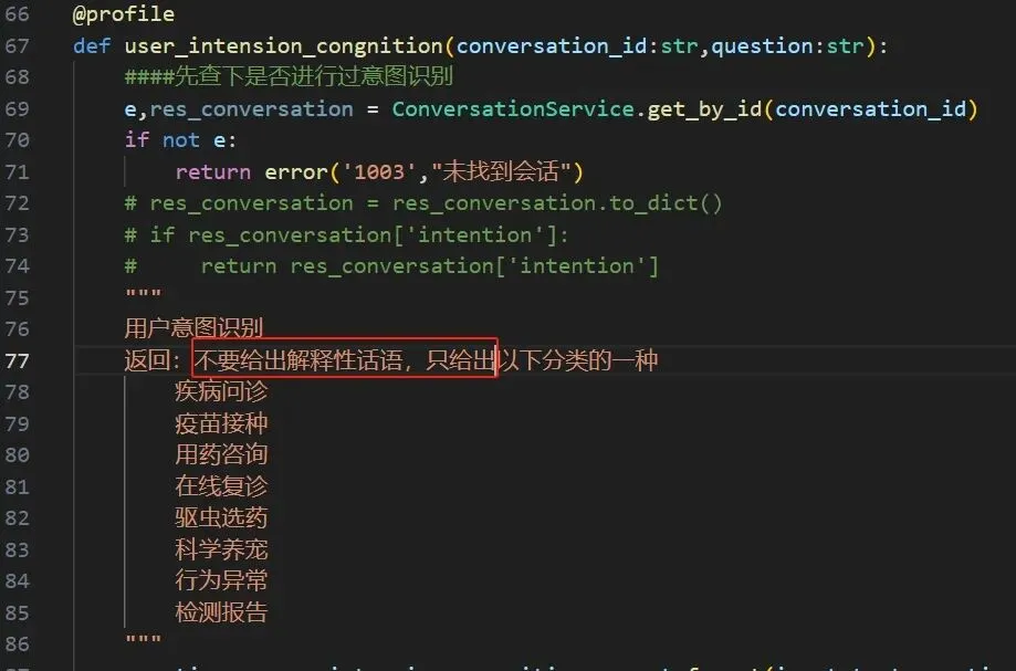 sub_answer = answer.split('\n\n', 1)[0] sub_answer = sub_answer.strip() log.info(f"sub_answer: {get_caller_line_number()} {sub_answer}\n\n\n\n") ####处理返回 '''【看起来您复制的格式可能有点小问题,根据您的描述,我将直接进行分类。 对于您提到的狗狗总是打喷嚏,特别是在早上和晚上,偶尔还会流鼻涕的情况,这属于: 呼吸道 如果您有更多关于宠物健康的问题或者需要进一步的帮助,请随时告诉我。】 ''' if len(sub_answer) > 5: ##意图识别 if specify_type == 100: res_res =[ '疾病问诊', '疫苗接种', '用药咨询', '在线复诊', '驱虫选药', '科学养宠', '行为异常', '检测报告'] for res in res_res: if res in answer: answer = res break ###分科 else: res_res =[ '消化道', '呼吸道', '尿道', '皮肤', '五官', '四肢和骨骼'] for res in res_res: if res in answer: answer = res break else: answer = sub_answer