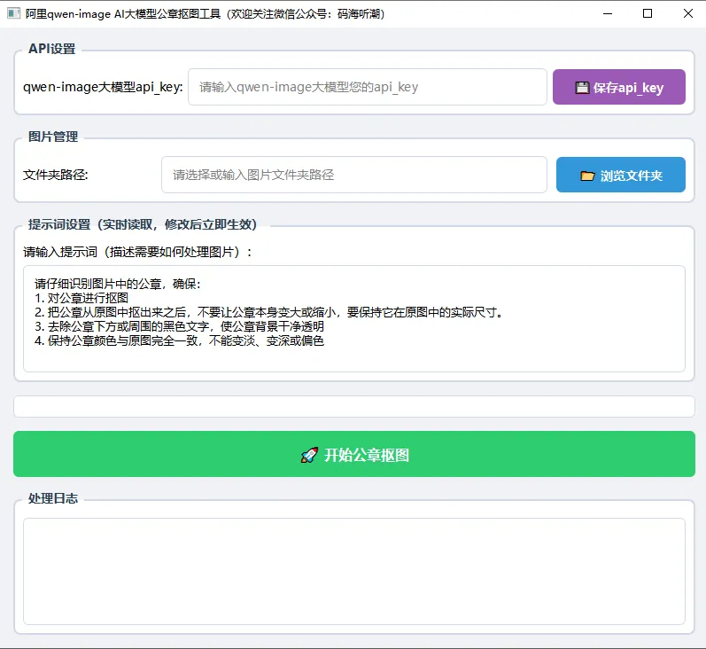 import sysimport osimport jsonfrom pathlib import Pathfrom PyQt6.QtWidgets import ( QApplication, QMainWindow, QWidget, QVBoxLayout, QHBoxLayout, QPushButton, QLabel, QFileDialog, QTextEdit, QProgressBar, QGroupBox, QMessageBox, QLineEdit, QGridLayout)from PyQt6.QtCore import Qt, QThread, pyqtSignalfrom PyQt6.QtGui import QFont# --- 配置文件路径 ---CONFIG_FILE = "watermark_remover_config.json"# --- 配置管理函数 ---def load_config(): """加载配置文件""" default_config = { "api_key": "", # 默认API Key "output_dir": "output", "last_folder": "", # 上次选择的文件夹路径 } if os.path.exists(CONFIG_FILE): try: with open(CONFIG_FILE, 'r', encoding='utf-8') as f: config = json.load(f) # 确保所有必要的键都存在 for key in default_config: if key not in config: config[key] = default_config[key] return config except Exception as e: print(f"读取配置文件失败: {str(e)},使用默认配置") return default_config else: return default_configdef save_config(config): """保存配置文件""" try: with open(CONFIG_FILE, 'w', encoding='utf-8') as f: json.dump(config, f, ensure_ascii=False, indent=2) return True except Exception as e: print(f"保存配置文件失败: {str(e)}") return False# --- 工作线程类(仅保留框架,移除业务逻辑)---class WatermarkRemovalWorker(QThread): """公章抠图工作线程(框架)""" progress_signal = pyqtSignal(str) progress_value_signal = pyqtSignal(int) result_signal = pyqtSignal(dict) error_signal = pyqtSignal(str) def __init__(self, image_paths, api_key, prompt_text): super().__init__() self.image_paths = image_paths self.api_key = api_key self.prompt_text = prompt_text self.running = True def run(self): """线程执行函数(模拟处理过程)""" total_images = len(self.image_paths) for idx, image_path in enumerate(self.image_paths): if not self.running: break # 模拟处理进度 progress_value = int(((idx + 1) / total_images) * 100) self.progress_value_signal.emit(progress_value) # 模拟处理消息 self.progress_signal.emit(f"正在处理第 {idx + 1}/{len(self.image_paths)} 张图片: {os.path.basename(image_path)}") # 模拟处理延迟 self.msleep(500) # 模拟处理结果 result = { 'success': True, 'original_file': image_path, 'processed_files': [f"output/{os.path.basename(image_path)}"], 'original_size': "1920x1080", 'file_size': "2.5MB", 'new_size': "1024x1024" } self.result_signal.emit(result) # 模拟错误(可选) # if idx == 2: # self.error_signal.emit(f"处理图片 {os.path.basename(image_path)} 时出错: 模拟错误") self.progress_signal.emit("处理完成!") def stop(self): """停止线程""" self.running = False# --- 主界面类 ---class WatermarkRemovalApp(QMainWindow): """公章抠图应用主窗口""" def __init__(self): super().__init__() self.image_files = [] self.worker = None self.current_image_index = 0 # 加载配置 self.config = load_config() self.api_key = self.config.get("api_key", "") self.init_ui() def init_ui(self): """初始化UI""" self.setWindowTitle("公章抠图工具(界面框架)") self.setGeometry(100, 100, 800, 700) # 设置样式 self.setStyleSheet(""" QMainWindow { background-color: #f0f2f5; } QGroupBox { font-size: 14px; font-weight: bold; border: 2px solid #d1d9e6; border-radius: 8px; margin-top: 10px; padding-top: 10px; background-color: white; } QGroupBox::title { subcontrol-origin: margin; left: 10px; padding: 0 5px 0 5px; color: #2c3e50; } QPushButton { font-size: 14px; padding: 10px 20px; border-radius: 6px; border: none; font-weight: bold; } QPushButton:hover { opacity: 0.9; } QPushButton:disabled { background-color: #bdc3c7; }#startButton { background-color: #2ecc71; color: white; font-size: 16px; padding: 15px 30px; }#folderButton { background-color: #3498db; color: white; }#saveKeyButton { background-color: #9b59b6; color: white; padding: 10px 15px; min-width: 120px; } QLabel { font-size: 14px; } QLineEdit { font-size: 14px; padding: 10px; border: 1px solid #d1d9e6; border-radius: 6px; background-color: white; } QTextEdit { border: 1px solid #d1d9e6; border-radius: 6px; padding: 8px; font-size: 13px; background-color: white; } QProgressBar { border: 1px solid #d1d9e6; border-radius: 6px; text-align: center; background-color: white; font-weight: bold; } QProgressBar::chunk { background-color: #3498db; border-radius: 6px; } """) # 创建中心部件 central_widget = QWidget() self.setCentralWidget(central_widget) main_layout = QVBoxLayout(central_widget) main_layout.setSpacing(15) main_layout.setContentsMargins(15, 15, 15, 15) # API设置组 api_group = QGroupBox("API设置") api_layout = QVBoxLayout() # API Key输入框和保存按钮(水平布局) api_key_layout = QHBoxLayout() api_key_label = QLabel("API Key:") self.api_key_edit = QLineEdit() self.api_key_edit.setText(self.api_key) self.api_key_edit.textChanged.connect(self.on_api_key_changed) self.api_key_edit.setPlaceholderText("请输入您的API Key") # 保存API Key按钮 save_key_button = QPushButton("💾 保存API Key") save_key_button.setObjectName("saveKeyButton") save_key_button.clicked.connect(self.save_api_key) api_key_layout.addWidget(api_key_label) api_key_layout.addWidget(self.api_key_edit) api_key_layout.addWidget(save_key_button) # 设置比例,让输入框占据更多空间 api_key_layout.setStretch(0, 1) api_key_layout.setStretch(1, 4) api_key_layout.setStretch(2, 1) api_layout.addLayout(api_key_layout) api_group.setLayout(api_layout) main_layout.addWidget(api_group) # 图片管理组 image_group = QGroupBox("图片管理") image_layout = QVBoxLayout() # 文件夹选择部分(使用网格布局) folder_layout = QGridLayout() folder_layout.setSpacing(10) # 文件夹路径输入框 folder_label = QLabel("文件夹路径:") self.folder_edit = QLineEdit() self.folder_edit.setPlaceholderText("请选择或输入图片文件夹路径") self.folder_edit.setText(self.config.get("last_folder", "")) # 文件夹选择按钮 self.folder_button = QPushButton("📂 浏览文件夹") self.folder_butto