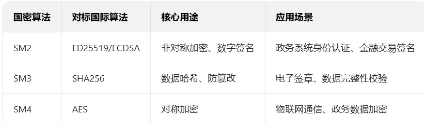 加密算法是基础:ED25519 等国际算法适配通用场景,国密算法适配敏感场景,选择需匹配合规要求;