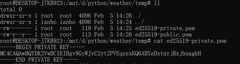 也就是说公钥、私钥文件是以.pem结尾的文本文件,尽管可以查看内容,但却是特殊格式的文件,必须经过ED25519 算法解析才能知道其含义。