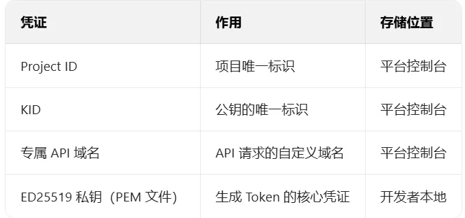 公钥 | 目标平台(如和风天气) | 验证 Token 签名的真伪(相当于 “印章防伪模板”) | 可公开,上传至平台并绑定项目,用于验签 |