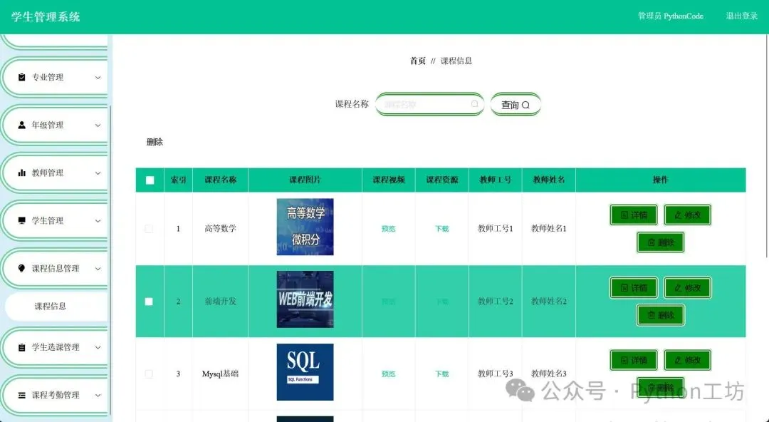 年级专业管理课程信息板块可以看到课程名称任课教师等信息,支持对课程信息的修改查看和删除等操作。