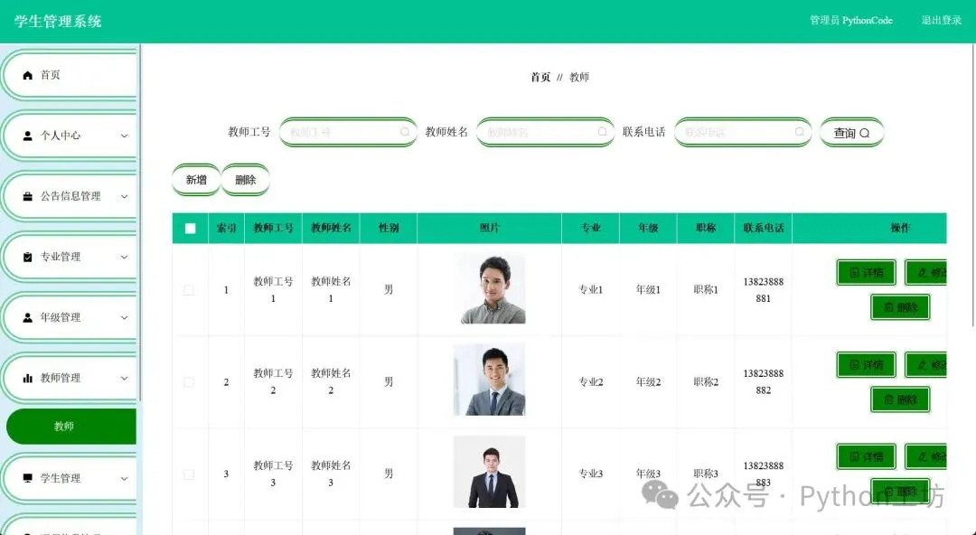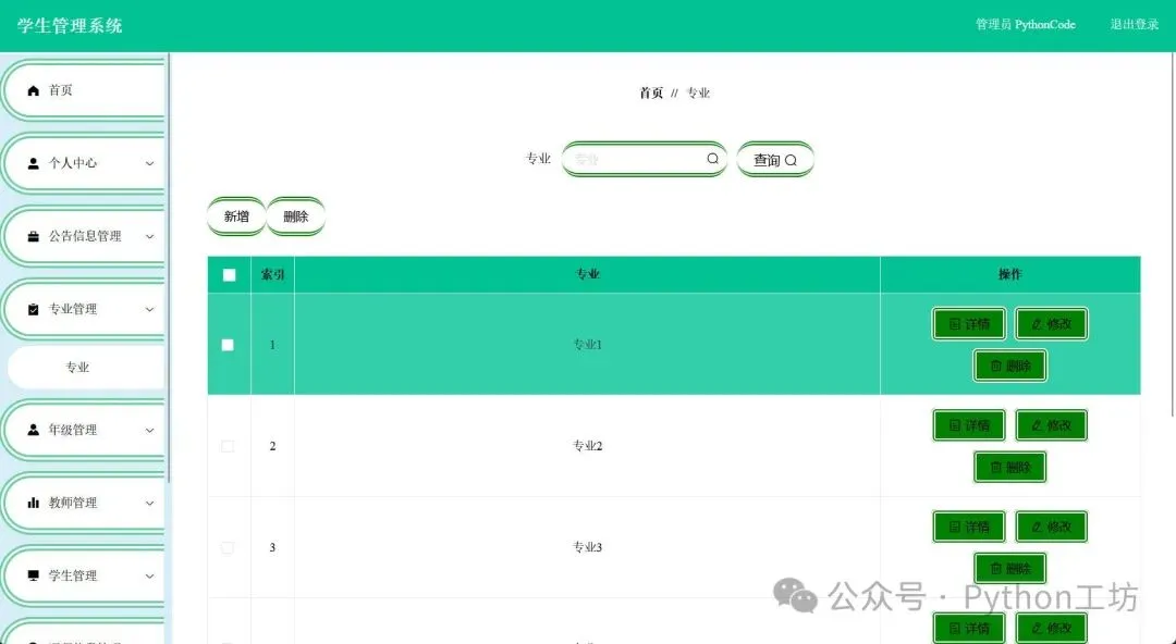 专业信息管理教师和学生信息管理板块可以对教师信息进行修改删除,点击详情可以看到更多信息。