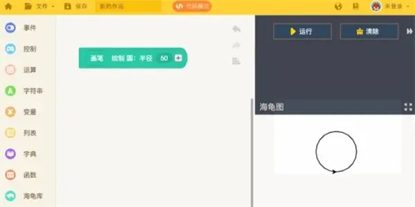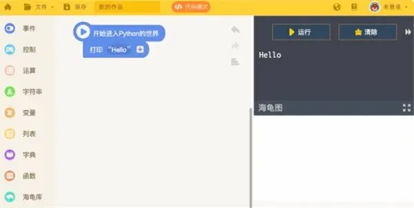 这款编程工具的基础操作简单易上手,拖出积木后点击右上角的“运行”,就能直接查看运行结果;从海龟库积木盒拖出积木再点击“运行”,还能实现一键绘图的效果。