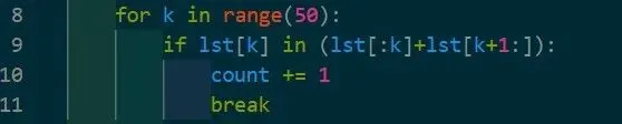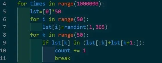 检测这个“班级”里有没有同一天“生日”的人,如果有则次数+1并退出循环
