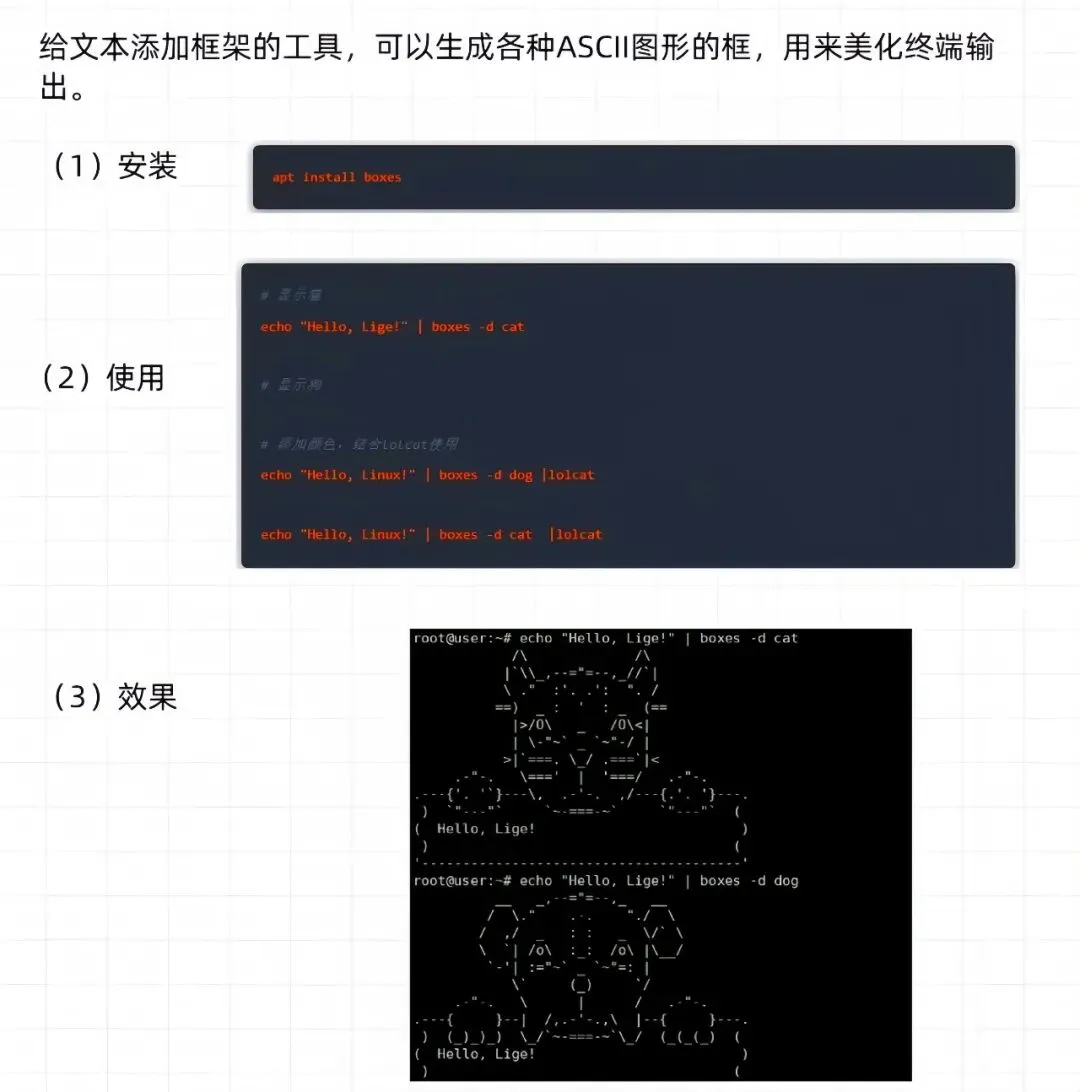 echo "Hello, Linux!"| boxes -d dog | lolcat