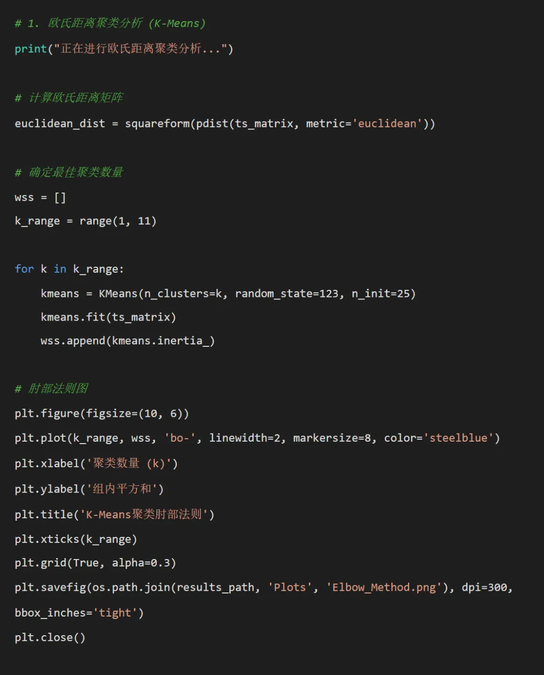# pip install pandas numpy matplotlib seaborn scikit-learn dtw-python joblibimport osimport pandas as pdimport numpy as npimport matplotlib.pyplot as pltimport seaborn as snsfrom sklearn.cluster import KMeansfrom sklearn.neighbors import KNeighborsClassifierfrom sklearn.metrics import accuracy_scorefrom sklearn.preprocessing import StandardScalerfrom scipy.spatial.distance import pdist, squareformimport dtwfrom datetime import datetimeimport warningswarnings.filterwarnings('ignore')# 设置路径desktop_path = os.path.join(os.path.expanduser("~"), "Desktop")data_path = os.path.join(desktop_path, "Results", "combined_weather_disease_data.csv")results_path = os.path.join(desktop_path, "Results时间EM")# 设置中文字体显示plt.rcParams['font.sans-serif'] = ['SimHei'] # 显示中文标签plt.rcParams['axes.unicode_minus'] = False # 显示负号# 创建结果文件夹sub_folders = ['Clustering', 'KNN', 'DTW', 'Plots', 'Models']for folder in sub_folders: os.makedirs(os.path.join(results_path, folder), exist_ok=True)print("开始基于距离的疾病时间序列分析...")# 读取数据combined_data = pd.read_csv(data_path)combined_data['timestamp'] = pd.to_datetime(combined_data['timestamp'])# 选择要分析的疾病target_diseases = ["influenza", "common_cold", "pneumonia","bacillary_dysentery", "hand_foot_mouth","hemorrhagic_fever"]print(f"目标疾病: {', '.join(target_diseases)}")# 数据预处理函数 - 按年汇总数据def prepare_yearly_data(data, diseases): data = data.copy() data['year'] = data['timestamp'].dt.year yearly_data = data.groupby('year')[diseases].sum().reset_index() yearly_data = yearly_data[(yearly_data['year'] >= 1981) & (yearly_data['year'] <= 2025)]return yearly_data# 数据预处理函数 - 创建时间序列矩阵def create_ts_matrix(data, diseases): ts_matrix = data.set_index('year')[diseases].valuesreturn ts_matrix# 应用数据预处理print("正在准备数据...")yearly_data = prepare_yearly_data(combined_data, target_diseases)ts_matrix = create_ts_matrix(yearly_data, target_diseases)years = yearly_data['year'].values# 划分训练集和测试集train_years = range(1981, 2016)test_years = range(2016, 2026)train_mask = yearly_data['year'].isin(train_years)test_mask = yearly_data['year'].isin(test_years)train_data = yearly_data[train_mask]test_data = yearly_data[test_mask]train_matrix = ts_matrix[train_mask]test_matrix = ts_matrix[test_mask]print(f"训练集大小: {len(train_data)} 年")print(f"测试集大小: {len(test_data)} 年")