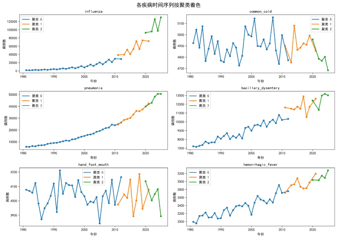 # 2.3 多序列对比图(按聚类着色)yearly_data_long = pd.melt( yearly_data, id_vars=['year', 'cluster'], value_vars=target_diseases, var_name='disease', value_name='cases')fig, axes = plt.subplots(3, 2, figsize=(14, 10))axes = axes.flatten()for i, disease in enumerate(target_diseases): disease_data = yearly_data_long[yearly_data_long['disease'] == disease]for cluster in disease_data['cluster'].unique(): cluster_data = disease_data[disease_data['cluster'] == cluster] axes[i].plot(cluster_data['year'], cluster_data['cases'], label=f'聚类 {cluster}', linewidth=2) axes[i].scatter(cluster_data['year'], cluster_data['cases'], s=20) axes[i].set_title(disease) axes[i].set_xlabel('年份') axes[i].set_ylabel('病例数') axes[i].legend()plt.suptitle('各疾病时间序列按聚类着色', fontsize=16)plt.tight_layout()plt.savefig(os.path.join(results_path, 'Plots', 'Multi_Series_Clusters.png'), dpi=300, bbox_inches='tight')plt.close()