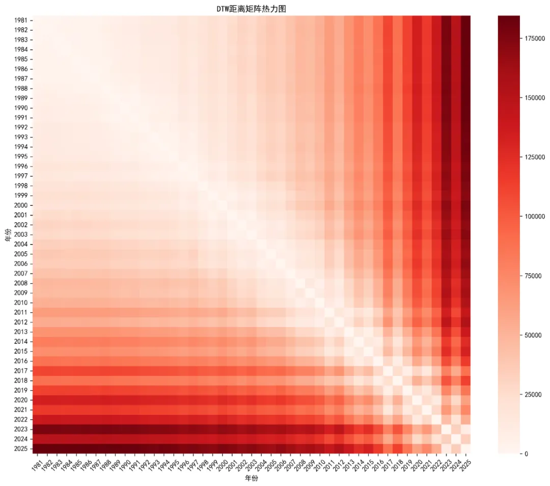 # 2.4 聚类热力图from sklearn.decomposition import PCA# 使用PCA降维进行可视化pca = PCA(n_components=2)X_pca = pca.fit_transform(ts_matrix)plt.figure(figsize=(10, 8))scatter = plt.scatter(X_pca[:, 0], X_pca[:, 1], c=kmeans_result, cmap='viridis', s=100)plt.colorbar(scatter, label='聚类')plt.title('K-Means聚类结果可视化')plt.xlabel('主成分 1')plt.ylabel('主成分 2')# 添加年份标签for i, year in enumerate(years): plt.annotate(str(year), (X_pca[i, 0], X_pca[i, 1]), xytext=(5, 5), textcoords='offset points', fontsize=8)plt.tight_layout()plt.savefig(os.path.join(results_path, 'Plots', 'Cluster_Heatmap.png'), dpi=300, bbox_inches='tight')plt.close()# 3. 基于KNN的时间序列分类print("正在进行KNN分类分析...")# 准备KNN数据knn_train = train_matrixknn_test = test_matrixknn_train_labels = kmeans_result[train_mask]# 寻找最佳k值k_values = range(1, 11)accuracy_values = []for k in k_values: knn = KNeighborsClassifier(n_neighbors=k) knn.fit(knn_train, knn_train_labels) knn_pred = knn.predict(knn_test) accuracy = accuracy_score(kmeans_result[test_mask], knn_pred) accuracy_values.append(accuracy)# K值选择图plt.figure(figsize=(10, 6))plt.plot(k_values, accuracy_values, 'bo-', linewidth=2, markersize=8, color='steelblue')plt.xlabel('K值')plt.ylabel('测试集准确率')plt.title('KNN分类准确率 vs K值')plt.xticks(k_values)plt.grid(True, alpha=0.3)plt.savefig(os.path.join(results_path, 'Plots', 'K_Selection.png'), dpi=300, bbox_inches='tight')plt.close()# 选择最佳k值best_k = k_values[np.argmax(accuracy_values)]print(f"最佳K值: {best_k}, 准确率: {max(accuracy_values):.3f}")# 使用最佳k值进行KNN预测knn = KNeighborsClassifier(n_neighbors=best_k)knn.fit(knn_train, knn_train_labels)knn_proba = knn.predict_proba(knn_test)knn_pred = knn.predict(knn_test)# KNN预测结果knn_results = pd.DataFrame({'year': test_data['year'].values,'actual_cluster': kmeans_result[test_mask].astype(str),'predicted_cluster': knn_pred.astype(str),'probability': np.max(knn_proba, axis=1),'correct': (knn_pred == kmeans_result[test_mask])})# 4. DTW(动态时间规整)分析print("正在进行DTW分析...")# 计算DTW距离矩阵n_years = len(ts_matrix)dtw_dist = np.zeros((n_years, n_years))# 使用更高效的DTW计算for i in range(n_years):for j in range(i, n_years):if i == j: dtw_dist[i, j] = 0else: distance = dtw.dtw(ts_matrix[i], ts_matrix[j]).distance dtw_dist[i, j] = distance dtw_dist[j, i] = distance# DTW距离热力图plt.figure(figsize=(12, 10))sns.heatmap(dtw_dist, cmap='Reds', xticklabels=years, yticklabels=years)plt.title('DTW距离矩阵热力图')plt.xlabel('年份')plt.ylabel('年份')plt.xticks(rotation=45)plt.yticks(rotation=0)plt.tight_layout()plt.savefig(os.path.join(results_path, 'Plots', 'DTW_Heatmap.png'), dpi=300, bbox_inches='tight')plt.close()# 查找最具代表性的序列(距离其他序列平均距离最小的)avg_dtw_dist = np.mean(dtw_dist, axis=1)most_typical_idx = np.argmin(avg_dtw_dist)most_atypical_idx = np.argmax(avg_dtw_dist)most_typical_year = years[most_typical_idx]most_atypical_year = years[most_atypical_idx]print(f"最具代表性的年份: {most_typical_year}")print(f"最不典型的年份: {most_atypical_year}")# 5. 公共卫生意义分析 - 识别疫情模式print("正在进行公共卫生模式分析...")# 分析每个聚类的特征cluster_profiles = yearly_data.groupby('cluster')[target_diseases].agg(['mean', 'std'])# 重命名列cluster_profiles.columns = [f'{col[0]}_{col[1]}'for col in cluster_profiles.columns]cluster_profiles = cluster_profiles.reset_index()# 识别聚类模式cluster_patterns = pd.DataFrame({'cluster': [str(i) for i in range(optimal_k)],'pattern_type': ['快速爆发型', '缓慢持续型', '平稳低发型'][:optimal_k],'description': ['病例数快速上升下降', '病例数持续较高水平', '病例数保持较低水平'][:optimal_k]})# 6. 生成综合报告图表# 7.1 聚类性能总结图fig, axes = plt.subplots(2, 2, figsize=(16, 12))# 肘部法则图axes[0,0].plot(k_range, wss, 'bo-', linewidth=2, markersize=8, color='steelblue')axes[0,0].set_xlabel('聚类数量 (k)')axes[0,0].set_ylabel('组内平方和')axes[0,0].set_title('K-Means聚类肘部法则')axes[0,0].set_xticks(k_range)axes[0,0].grid(True, alpha=0.3)# 聚类中心图sns.barplot(data=cluster_centers_long, x='disease', y='cases', hue='cluster', ax=axes[0,1])axes[0,1].set_title('聚类中心 - 各疾病平均病例数')axes[0,1].set_xlabel('疾病类型')axes[0,1].set_ylabel('平均病例数')axes[0,1].tick_params(axis='x', rotation=45)# 聚类分配时间线for cluster in yearly_data['cluster'].unique(): cluster_data = yearly_data[yearly_data['cluster'] == cluster] axes[1,0].scatter(cluster_data['year'], [1] * len(cluster_data), label=f'聚类 {cluster}', s=100)axes[1,0].plot(yearly_data['year'], [1] * len(yearly_data), 'gray', alpha=0.5)axes[1,0].set_title('聚类分配时间线 (1981-2025)')axes[1,0].set_xlabel('年份')axes[1,0].set_yticks([])axes[1,0].legend(title='聚类')# 聚类热力图scatter = axes[1,1].scatter(X_pca[:, 0], X_pca[:, 1], c=kmeans_result, cmap='viridis', s=100)axes[1,1].set_title('K-Means聚类结果可视化')axes[1,1].set_xlabel('主成分 1')axes[1,1].set_ylabel('主成分 2')plt.suptitle('基于欧氏距离的聚类分析总结', fontsize=16)plt.tight_layout()plt.savefig(os.path.join(results_path, 'Plots', 'Cluster_Analysis_Summary.png'), dpi=300, bbox_inches='tight')plt.close()# 7.2 KNN预测结果图plt.figure(figsize=(12, 8))colors = ['red'if not correct else'green'for correct in knn_results['correct']]plt.scatter(knn_results['year'], knn_results['correct'].astype(int), c=colors, s=200, alpha=0.7)for _, row in knn_results.iterrows(): plt.annotate(f"实际:{row['actual_cluster']}\n预测:{row['predicted_cluster']}", (row['year'], row['correct']), xytext=(5, 5), textcoords='offset points', fontsize=9)accuracy_rate = knn_results['correct'].mean() * 100plt.title(f'KNN分类预测结果 (k = 