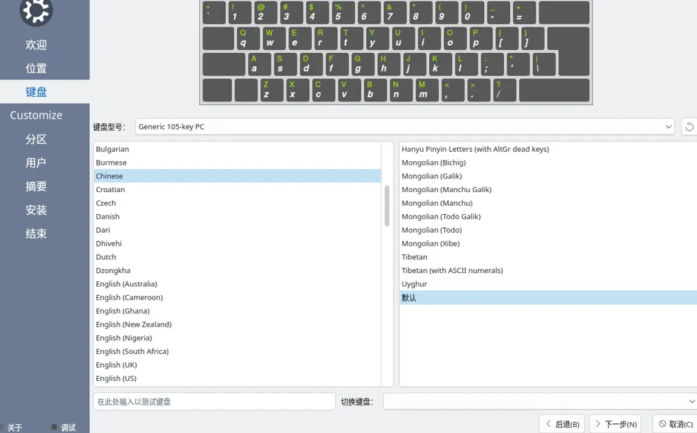 键盘布局不做任何设置即可,大部分主流的Linux发行版对主流的硬件设备能自动识别,如果确定无法正确识别,就手动设置一下,点下一步。