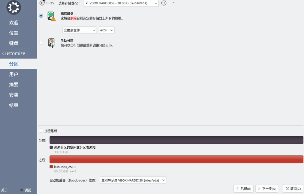 分区是最重要的一步,请务必确认要安装系统的目标硬盘没有重要的数据资料,一旦擦除安装了系统就无法找回了。有需要的可以手动分区,否则默认擦除并自动分区即可。